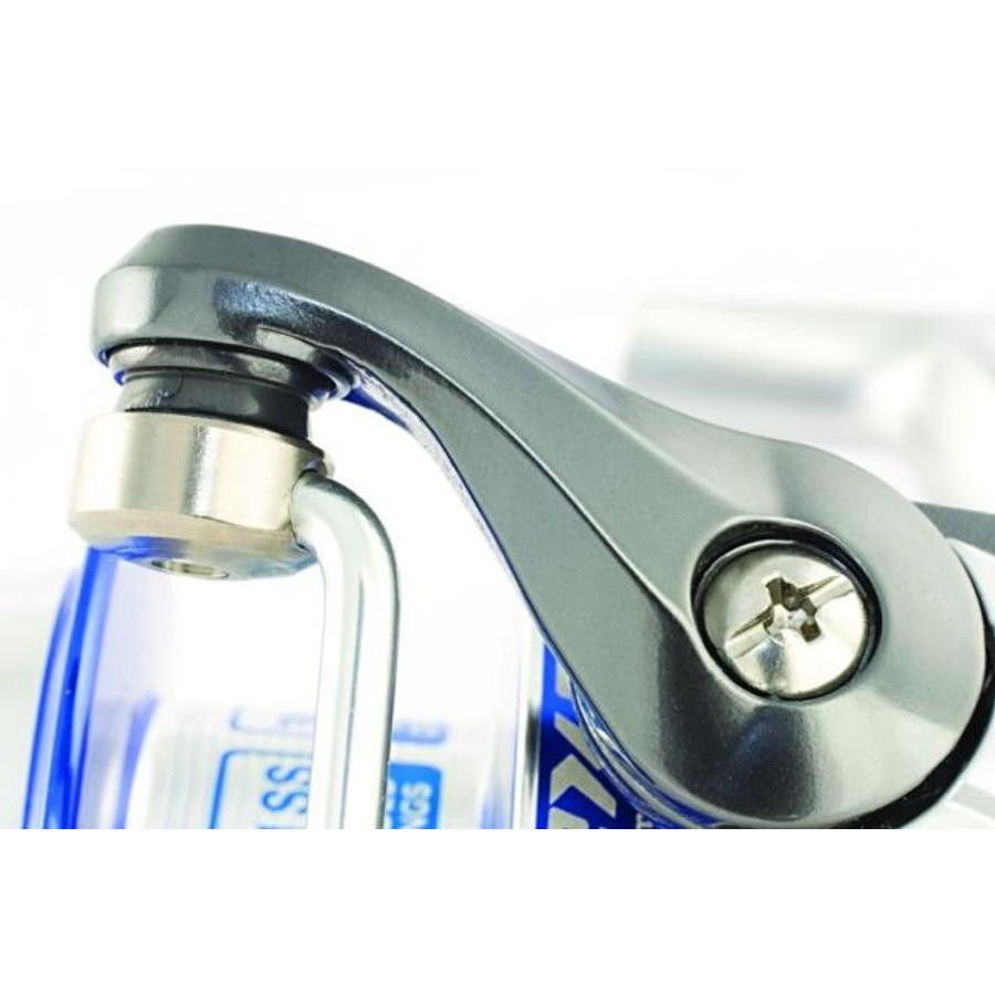 Il sistema frenante micrometrico, preciso e progettato per alte prestazioni, è stato costruito su una base in ottone per garantire un funzionamento impeccabile a lungo termine. Le lamelle a doppia dimensione sono una combinazione di acciaio inossidabile e tessuto di carbonio.