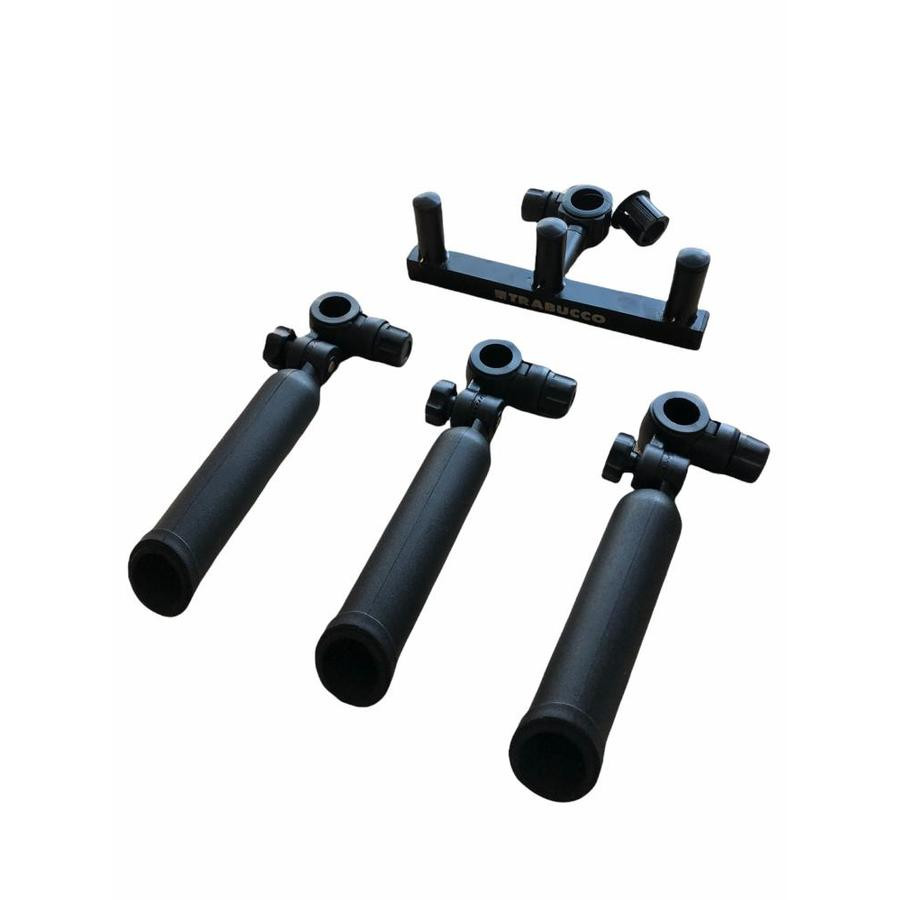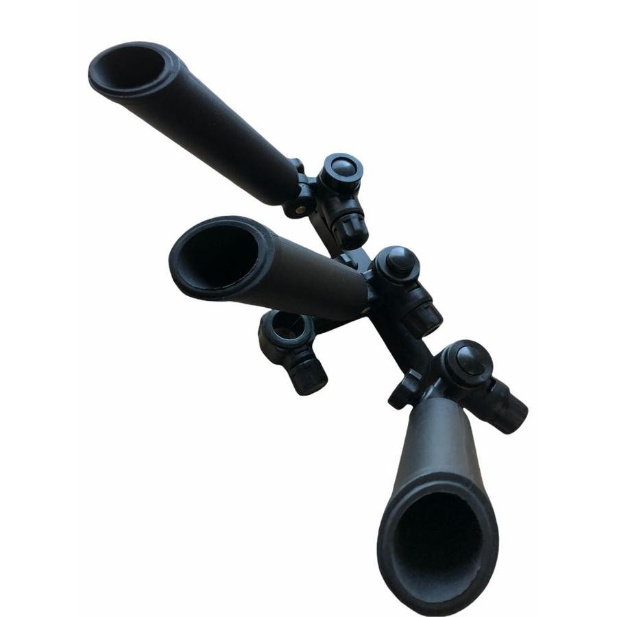 Portacanne robusto ma leggero, realizzato in alluminio, progettato per contenere 3 canne da pesca contemporaneamente. I portacanne sono regolabili in qualsiasi angolazione. Le manopole delle viti di fissaggio sono molto comode.