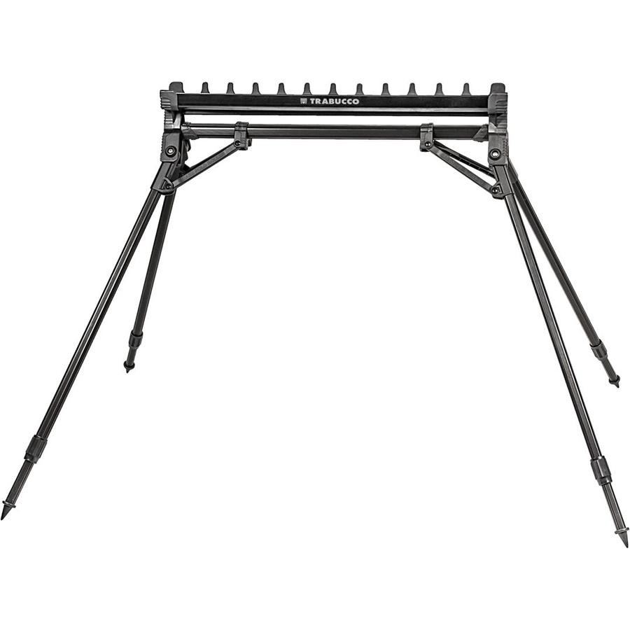 Portacanne di qualità – con telaio in alluminio – che può essere montato e smontato in pochi istanti, grazie al fatto che due gambe possono essere mosse contemporaneamente con un solo movimento. Con l'aiuto delle gambe telescopiche, non è un problema regolarlo nella posizione corretta anche nelle condizioni di terreno più difficili. Adatto per riporre 12 canne. Le parti a contatto con la canna hanno ricevuto un rivestimento in EVA.