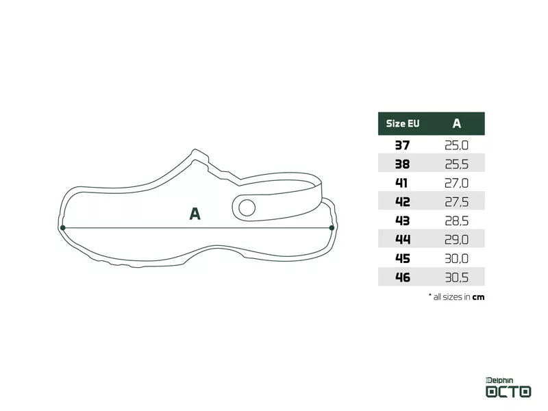 La storia dell'origine del nome OCTO è estremamente interessante. L'abbiamo progettata con la forma stilizzata dei tentacoli di un polpo, che garantiscono un'ottima aderenza in tutte le condizioni. Il polpo in inglese è OCTOpus, in latino OCTOpoda, queste due parole hanno ispirato il design e la denominazione, che abbiamo abbreviato in OCTO. Un altro dettaglio raffinato sono le grandi aperture laterali, che servono principalmente per la ventilazione. Non sono posizionate intenzionalmente al livello della suola, come di solito è consueto, ma leggermente più in alto. Questo è importante perché aiuta a prevenire che sabbia o ghiaia entrino facilmente tra la ciabatta e la suola, specialmente quando si è sulla riva o in acque poco profonde. Quindi i tuoi piedi possono sentirsi massimamente protetti. Inoltre, la fitta perforazione nella parte inferiore contribuisce alla ventilazione. Su un lato abbiamo usato il simbolo della lettera D dal logo Delphin, sull'altro lato la lettera O, che è l'iniziale del nome OCTO. La texture fine sulla superficie della suola, che ricorda la pelle di seppia, accentua ulteriormente l'effetto complessivo. Grazie al materiale EVA, le ciabatte sono estremamente leggere, resistenti e galleggiano. Naturalmente, il modello include anche un cinturino posteriore, che aiuta a fissare il piede, soprattutto quando si usa su terreni irregolari o in pendenza.