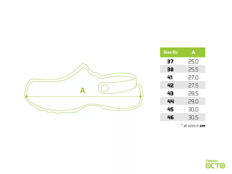 La storia dell'origine del nome OCTO è estremamente interessante. L'abbiamo progettata con la forma stilizzata dei tentacoli di un polpo, che garantiscono un'ottima aderenza in tutte le condizioni. Il polpo in inglese è OCTOpus, in latino OCTOpoda, queste due parole hanno ispirato il design e la denominazione, che abbiamo abbreviato in OCTO. Un altro dettaglio raffinato sono le grandi aperture laterali, che servono principalmente per la ventilazione. Non sono posizionate intenzionalmente al livello della suola, come di solito è consueto, ma leggermente più in alto. Questo è importante perché aiuta a prevenire che sabbia o ghiaia entrino facilmente tra la ciabatta e la suola, specialmente quando si è sulla riva o in acque poco profonde. Quindi i tuoi piedi possono sentirsi massimamente protetti. Inoltre, la fitta perforazione nella parte inferiore contribuisce alla ventilazione. Su un lato abbiamo usato il simbolo della lettera D dal logo Delphin, sull'altro lato la lettera O, che è l'iniziale del nome OCTO. La texture fine sulla superficie della suola, che ricorda la pelle di seppia, accentua ulteriormente l'effetto complessivo. Grazie al materiale EVA, le ciabatte sono estremamente leggere, resistenti e galleggiano. Naturalmente, il modello include anche un cinturino posteriore, che aiuta a fissare il piede, soprattutto quando si usa su terreni irregolari o in pendenza.