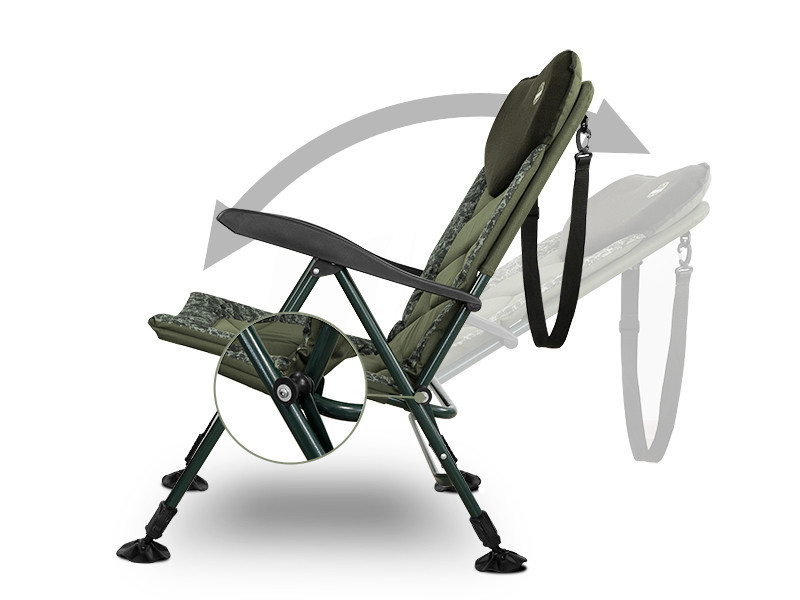 L'altezza delle gambe della sedia può essere regolata con un meccanismo a leva, consentendo di adattarsi a terreni irregolari durante la pesca in condizioni difficili. La posizione della sedia è inoltre garantita da piedini girevoli stabili con una grande superficie, per evitare che le gambe affondino nel terreno umido in riva al mare.