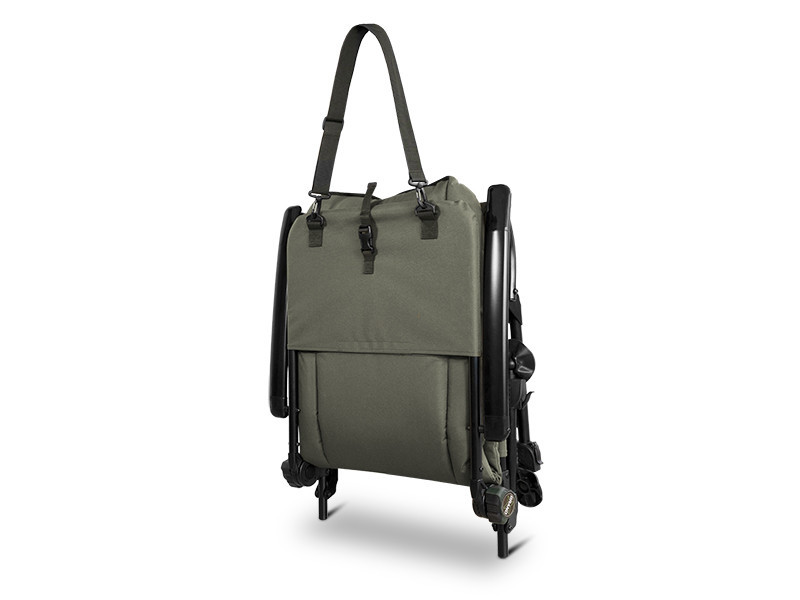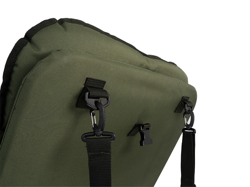 La robusta struttura in acciaio saldato garantisce solidità, mentre le gambe regolabili ad ampio angolo offrono grande stabilità, apprezzata in particolare dai pescatori più pesanti. Nonostante la sua robusta costruzione, la sedia è relativamente leggera. Per un facile trasporto, la sedia è dotata di una cinghia rimovibile che può essere appesa a spalla, liberando le mani per il resto dell'attrezzatura da pesca. Inoltre, la sedia dispone di una clip in plastica che fissa la posizione della sedia durante il trasporto e ne impedisce l'apertura indesiderata.