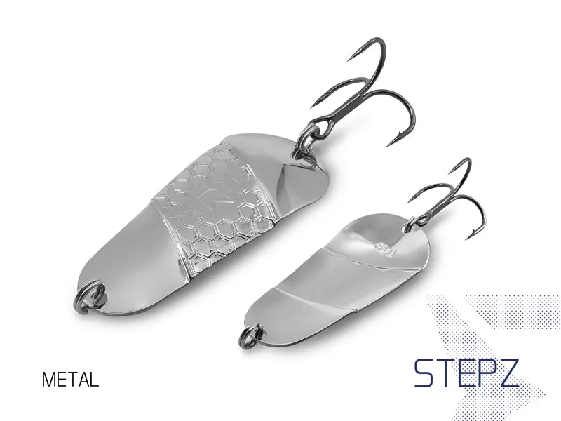 Le originali cucchiaini della serie Delphin Stepz StripScale sono stati progettati per creare un movimento irresistibile e aggressivo nell'acqua, provocando all'attacco anche i predatori più astuti. Il corpo in ottone di grandi dimensioni, dalla forma speciale, affonda a velocità media e produce un movimento provocatorio.