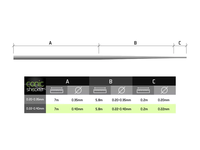 L'essenza del terminale affusolato conico risiede nel suo diametro gradualmente variabile, grazie al quale può essere legato alla lenza madre con un nodo molto piccolo. Questo è uno dei parametri chiave per uno svolgimento molto più facile della lenza dal mulinello e per una transizione fluida attraverso gli anelli.