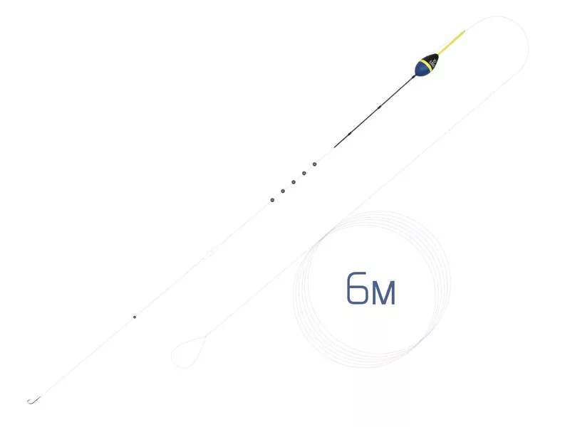 Una montatura pronta pre-legata, lunga 6 m, progettata per la pesca con canna fissa, che include un galleggiante a forma di goccia con peso di 0,5-3 g, piombato con pallini, e un amo.
