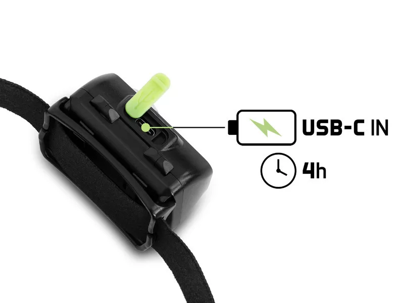 La torcia frontale è alimentata da una batteria integrata da 1200 mAh, ricaricabile tramite cavo USB-C. La ricarica completa richiede circa 4 ore. Sulla lampada è presente anche un indicatore di carica.