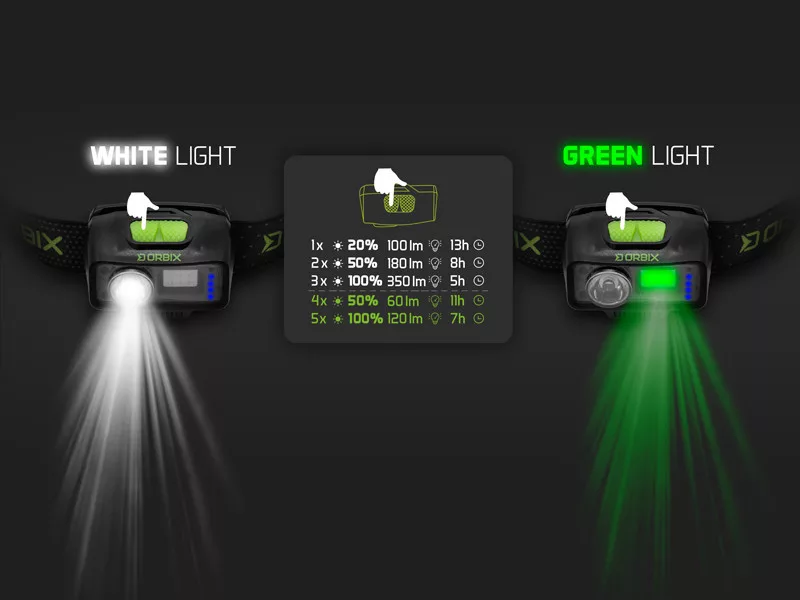 Due diodi LED forniscono l'illuminazione, e possiamo scegliere tra luce bianca e verde. Alla prima pressione del pulsante, si accende una luce bianca al 20% (100 lm), che illumina per 13 ore. La seconda pressione del pulsante fornisce una luminosità del 50%, che funziona per 8 ore. Alla terza pressione del pulsante, si accende la massima luminosità, al 100% (350 lm), che garantisce un'autonomia di 5 ore.