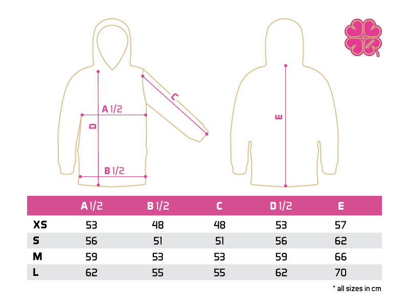 Sul davanti della felpa si trova una grande tasca chiudibile con una cerniera doppia di qualità. Le tasche laterali terranno le mani al caldo nei periodi più freddi. Il cappuccio è rosa all'esterno e nero all'interno, decorato con il logo Delphin e un trifoglio a quattro foglie di colore giallo. Inoltre, è dotato di una coulisse nera. La felpa con cappuccio ha una vita e polsini elastici aderenti.