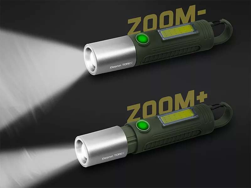 La lampada da campeggio Delphin Torix è un dispositivo di illuminazione pratico e ricaricabile, progettato specificamente per l'uso all'aperto, in particolare per la pesca. Grazie alle sue dimensioni compatte (17 × 3 cm) e alle sue funzioni versatili, è la scelta ideale come lampada da tenda, torcia o luce ausiliaria per i lanci notturni. La funzione ZOOM integrata permette di regolare il fascio luminoso da una luce ampia e diffusa a un raggio stretto e concentrato, così la lampada si adatta a diverse situazioni, che si tratti di illuminazione mirata o luce d'ambiente.