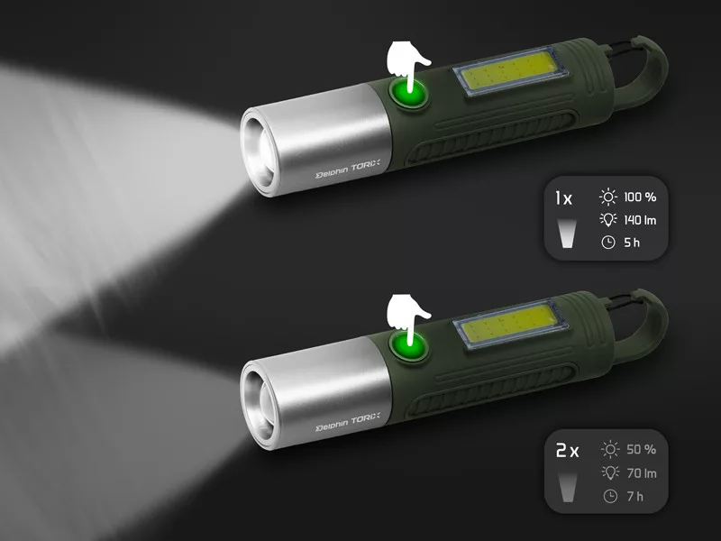 La Delphin Torix è dotata di due diodi LED che offrono diverse modalità di illuminazione. La prima pressione del pulsante attiva il LED principale al 100% di luminosità, che fornisce 140 lumen e funziona per circa 5 ore. La seconda pressione riduce la luminosità al 50% (70 lumen), estendendo l'autonomia a circa 7 ore. La terza pressione accende il secondo LED, che illumina con 170 lumen, anch'esso con un'autonomia di 5 ore. La quarta pressione accende una luce verde, ideale come indicatore di posizione, che funziona per un massimo di 24 ore.