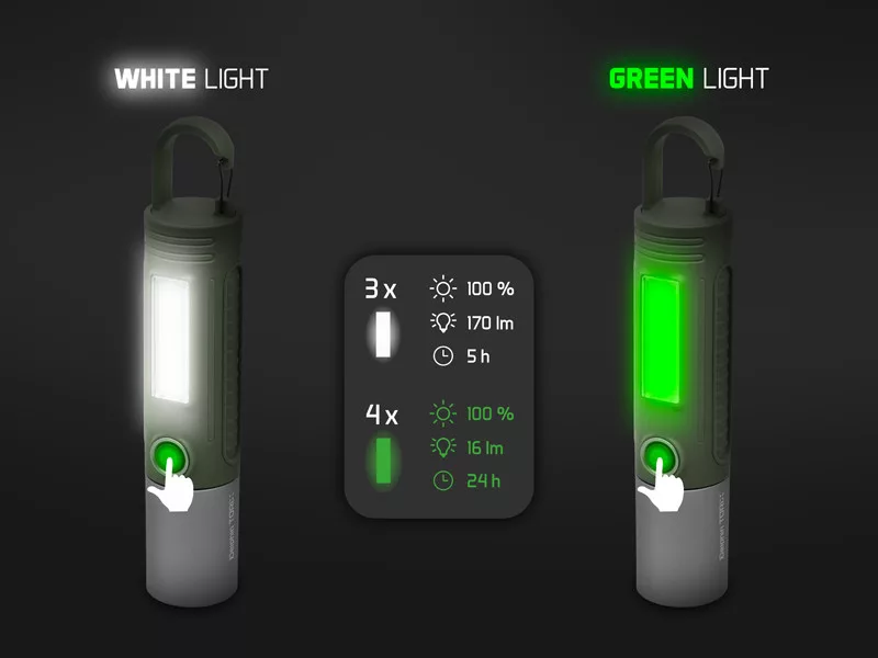 Il corpo della lampada è realizzato in plastica durevole e resistente alle intemperie, che resiste allo stress meccanico e agli effetti ambientali esterni. La batteria Li-ion integrata di tipo 18650 con una capacità di 2200 mAh e una tensione di 3.7 V fornisce energia sufficiente per un massimo di 24 ore di funzionamento. La ricarica avviene tramite una porta USB-C, con l'aiuto del cavo in dotazione, e richiede circa 3 ore. Il livello di carica è indicato dall'indicatore LED integrato nel pulsante di accensione, in modo da poter sempre monitorare con precisione lo stato della batteria.