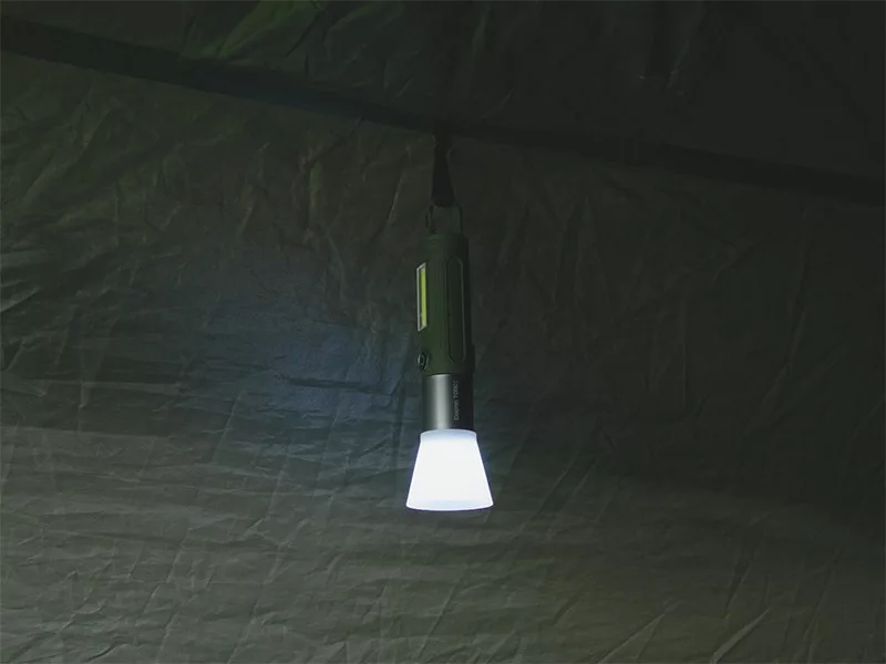 L'utilizzo della lampada è semplice: le modalità di illuminazione possono essere cambiate tramite il pulsante integrato nel corpo della lampada. La confezione include anche un pratico diffusore che può essere fissato al riflettore e trasforma la luce in un'illuminazione piacevole e diffusa, particolarmente utile in tenda o per il riposo. Il gancio situato sulla parte superiore della lampada permette di appenderla facilmente, mentre la sua forma conica la rende stabile anche su superfici piane.