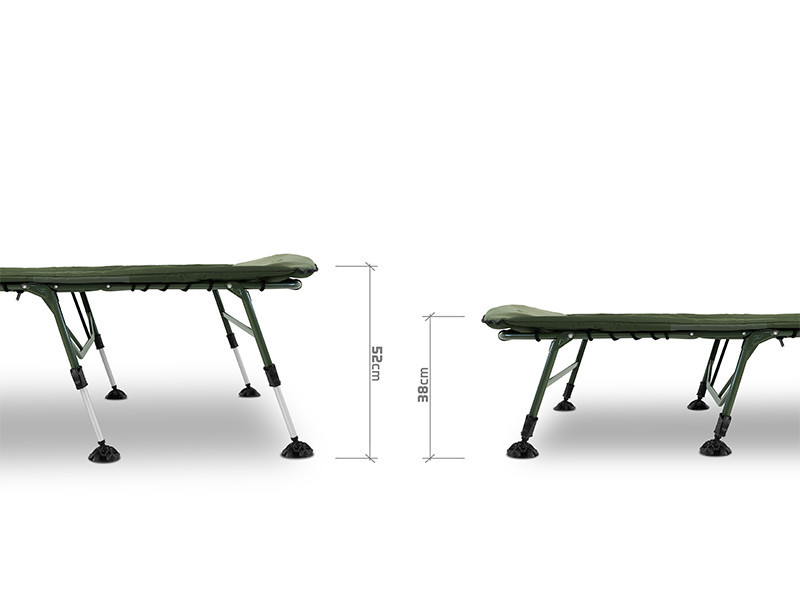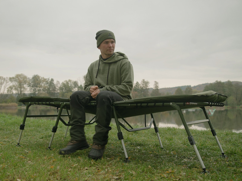 Il letto da pesca è costruito su una robusta struttura metallica ad alta capacitá di carico, resistente all'uso intenso, eppure leggero e facile da trasportare. Il meccanismo di fissaggio delle gambe nella parte della testa impedisce la chiusura indesiderata, consentendo un montaggio sicuro e rapido. L'intera superficie del materasso è rivestita in morbido pile, piacevole al tatto e che assicura una sensazione di calore nelle notti fresche. Il bordo è protetto da un resistente tessuto 600D verde oliva, resistente all'usura e che garantisce una lunga durata.