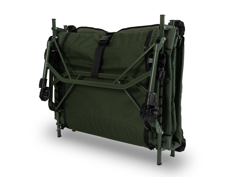 Il letto da pesca può essere aperto e chiuso in pochi secondi, rendendolo utilizzabile rapidamente e senza sforzo. Il trasporto sicuro è facilitato da cinghie rimovibili e regolabili in lunghezza, chiuse da robuste fibbie in plastica – queste impediscono l'apertura accidentale durante il trasporto.