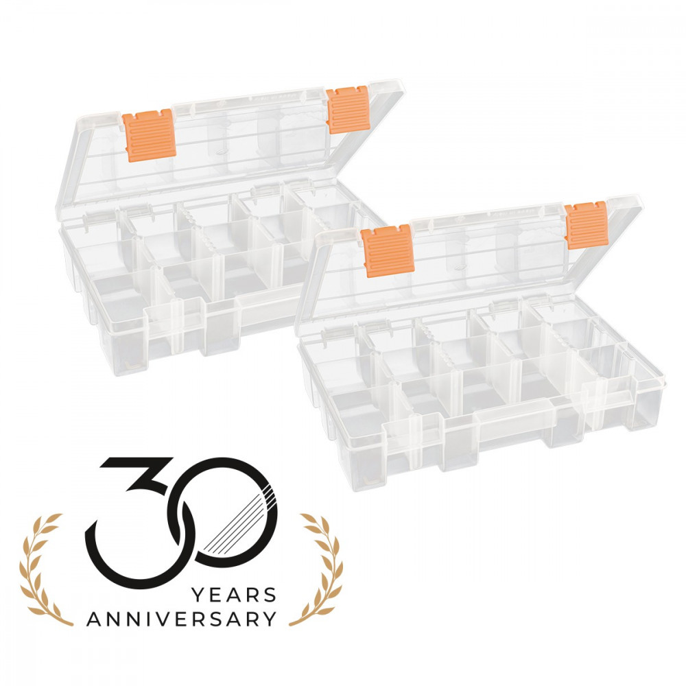 Il Fishing Box Organizer Duopack è una scatola per esche artificiali realizzata con materiali di qualità. La scatola stessa è trasparente, quindi possiamo vederne il contenuto senza aprirla. È facile da chiudere e aprire grazie ai suoi fermagli. Scatola realizzata in materiale flessibile e resistente, con un design pratico. Le pareti divisorie all'interno della scatola sono rimovibili, quindi l'interno può essere variato e diviso a piacere. Eccellente per i pescatori a spinning, ma anche accessori per altri metodi di pesca possono essere comodamente riposti al suo interno. Sulla scatola è stata apposta una scala di misurazione da 24cm. È una scatola molto leggera, il suo peso è di soli 320g e le sue dimensioni di trasporto sono 27.5x18x5.5cm, quindi si adatta a spazi ridotti ed è facile da trasportare. La scatola contiene 3 scomparti da 5,5x27x5,2cm, con 10 divisori inclusi, che permettono di creare 1 scomparto da 5,5x5,5x5,2cm.