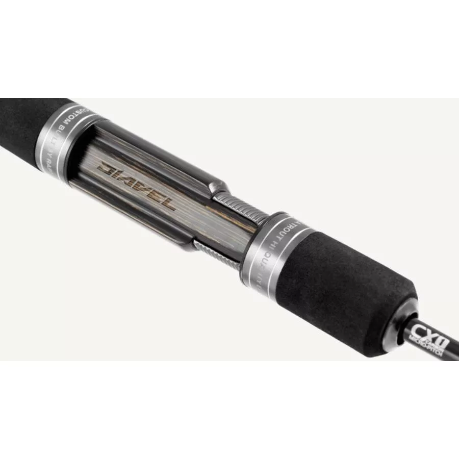Il corpo della canna è costituito da carbonio CX-1 Micro Pitch ad alto modulo, che si traduce in una struttura super sottile ma incredibilmente robusta e flessibile. Questo materiale garantisce una risposta rapida e un'eccellente trasmissione delle vibrazioni, così anche la più piccola abboccata è immediatamente percepibile. L'azione regular slow si adatta perfettamente all'uso di cucchiaini leggeri e fili sottili, rendendo la pesca con essa non solo tecnica ma anche estremamente divertente.