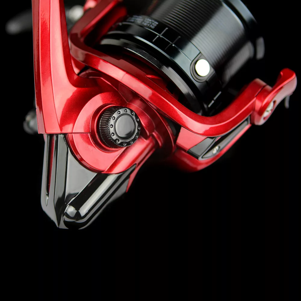 Per quanto riguarda l'aspetto, è caratterizzato da un design pulito e raffinato, elegante e sportivo, con colori rosso e nero. Il Long Cast è un mulinello con una costruzione robusta che, nonostante ciò, è rimasto relativamente leggero; anche la dimensione più grande pesa solo 534 grammi. Una delle sue particolarità è il freno rapido di precisione, al 100% resistente alla polvere e agli schizzi  , che può essere quasi completamente bloccato con mezzo giro. Perché è necessario? Durante la pesca a lunga distanza, se il freno non è completamente bloccato o stabilizzato, la lenza può scivolare durante un lancio potente, causando gravi lesioni alle dita. La possibilità che ciò accada può essere completamente eliminata con un movimento rapido. Il freno a lamelle in feltro, protetto dalla polvere, funziona naturalmente in modo impeccabile in qualsiasi posizione del freno e rilascia la lenza delicatamente. Inoltre, il freno del rotore – particolarmente importante nei mulinelli da long cast – blocca la rotazione del rotore con l'archetto aperto, prevenendo il ritorno accidentale dell'archetto durante il lancio. Nel corpo sottile, elegante, rosso e nero, si trova una struttura con rapporto di trasmissione medio (4,6:1) . I 6+1 cuscinetti all'interno del corpo garantiscono un funzionamento fluido e scorrevole. La super lenta (la bobina si solleva e si abbassa una volta in 9 giri di manovella), l'oscillazione della bobina a vite senza fine è responsabile della precisa bobinatura della lenza. La sua bobina da long cast in alluminio di grande diametro (69 mm) non solo permette un recupero rapido della lenza, ma grazie al bordo di uscita ottimizzato per il lancio a lunga distanza, la lenza scorre via più velocemente e con molta meno resistenza. Una caratteristica comune dei mulinelli a bobina fissa è che la lenza può attorcigliarsi sotto la bobina se usata con disattenzione. Per eliminare questo inconveniente, sotto la bobina è posizionato un „gabbia anti-groviglio” sull'asse, che è praticamente invisibile. Sulla bobina ci sono naturalmente 2 clip per lenza metalliche arrotondate . Il rullino guidafilo con cuscinetto garantisce che la lenza non si attorcioli e che venga posizionata con precisione.