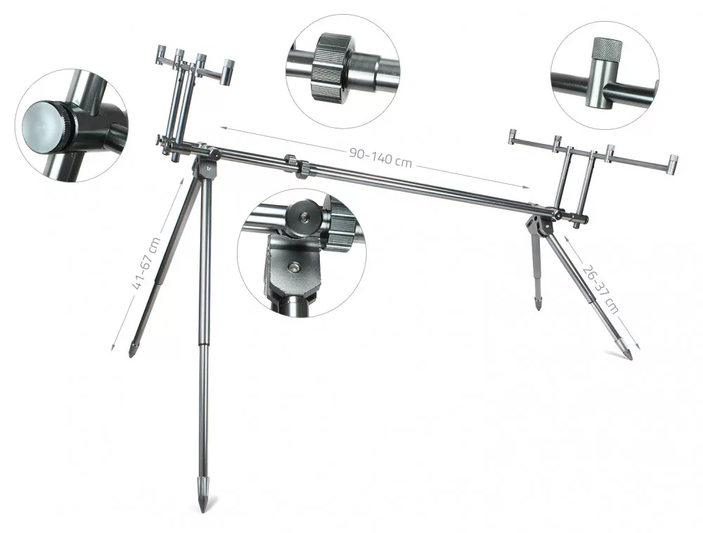 Grazie alla traversa a quattro canne, possiamo posizionare le nostre canne alla distanza desiderata l'una dall'altra. Le gambe telescopiche autobloccanti consentono una regolazione continua delle gambe e le traverse regolabili in altezza permettono di abbassare il baricentro del rod pod, il che è molto vantaggioso in caso di vento. Su le traverse con controdado, gli indicatori di abboccata e i supporti per canne possono essere facilmente fissati nella posizione corretta. Una borsa per il trasporto imbottita protegge dai danni durante il trasporto.