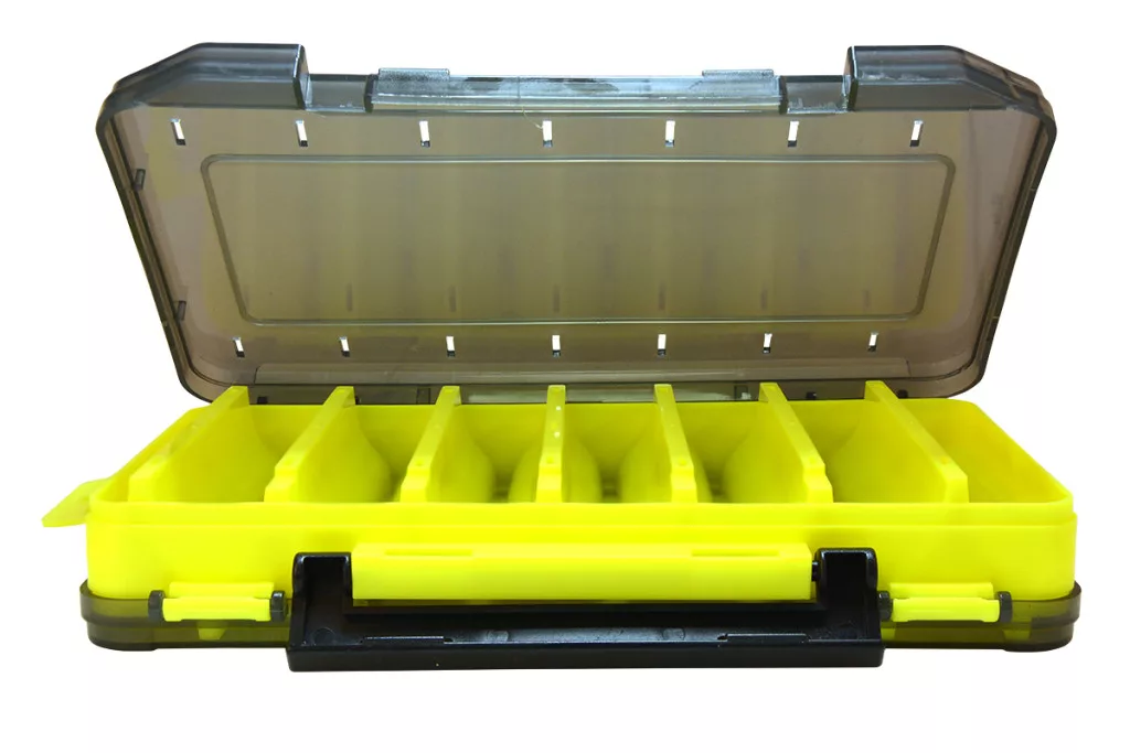 La scatola è realizzata in plastica robusta e resistente agli urti, che resiste alle sollecitazioni dell'uso quotidiano. Il coperchio trasparente color fumo consente al pescatore di visualizzare il contenuto con un'occhiata, evitando di dover aprire la scatola ogni volta. La parte interna è realizzata con scomparti di colore giallo brillante, che rendono ben visibile la forma e il colore delle esche, accelerando e rendendo più comoda la scelta.