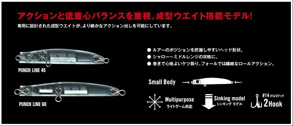 Dimensioni e Peso Compatti: Nonostante la lunghezza di soli 4,5 cm e il peso di 3 grammi, il Punch Line 45 può essere lanciato con sorprendente precisione. Questa dimensione imita perfettamente i piccoli pesci esca, irresistibili per la maggior parte dei predatori. Si armonizza perfettamente anche con attrezzature più delicate.