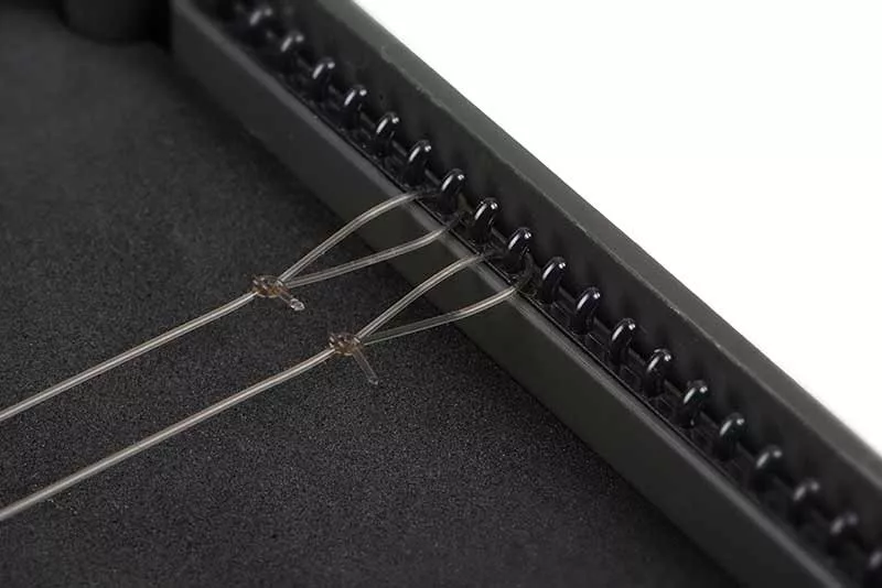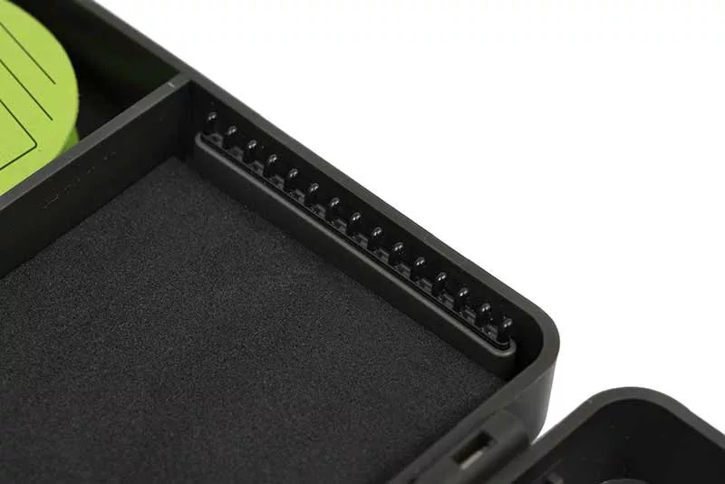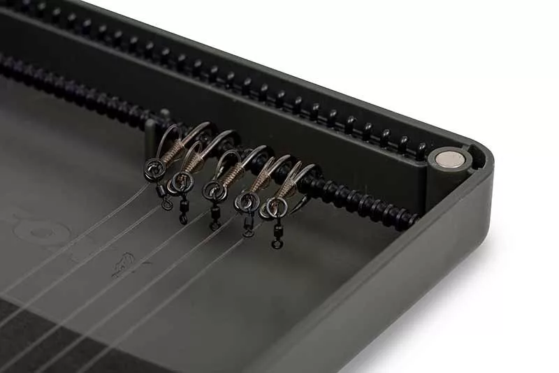 Il sistema permette di fissare saldamente 7 dischi in EVA sui perni che sporgono dalla scatola, così i rig Chod, Spinner e Zig saranno sempre a portata di mano. I fermi per terminali crimpati su entrambi i lati garantiscono uno stoccaggio efficace, mentre la schiuma EVA ad alta densità impedisce il movimento degli aghi di fissaggio, mantenendoli sempre al sicuro.