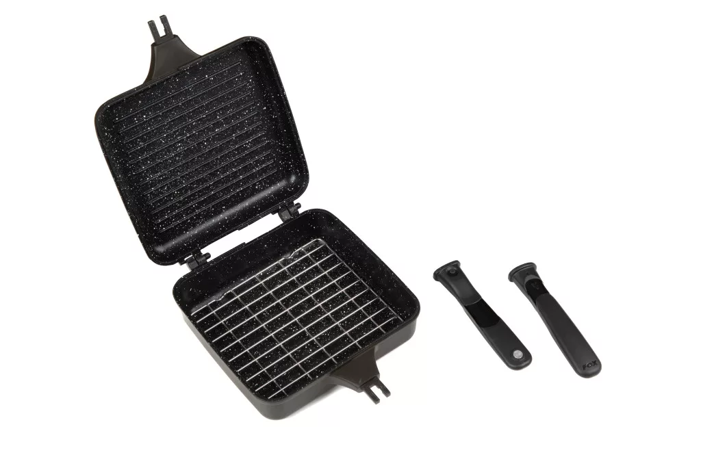 Il prodotto è realizzato in alluminio pressofuso, che garantisce durabilità e un'eccellente distribuzione del calore, in modo che i cibi cuocano in modo uniforme. Il design a cerniera e smontabile consente di utilizzare le due metà della padella separatamente – una tradizionale e l'altra con superficie grill. La metà tradizionale della padella è profonda 47 mm, ideale per preparare zuppe, stufati o piatti unici, mentre la metà grill è profonda 22,5 mm, perfetta per grigliare carni, verdure o pietanze per la colazione.