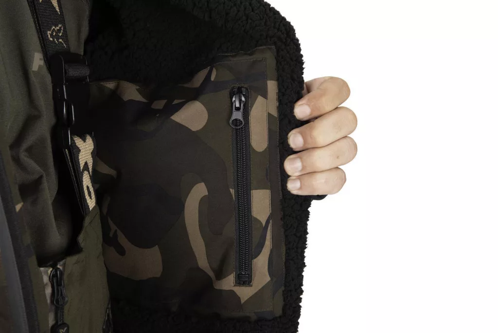 Grazie al suo design pratico, la giacca Fox Camo Sherpa Tec è particolarmente utile per gli amanti della pesca. È dotata di un cappuccio rimovibile che, grazie alla sua visiera, protegge efficacemente dalla pioggia e dal vento. I cordoncini regolabili in vita e sull'orlo inferiore consentono alla giacca di adattarsi perfettamente al corpo, il che è particolarmente importante per la libertà di movimento e l'isolamento termico.__5__Il motivo mimetico AOP Fox della giacca non solo garantisce un aspetto elegante, ma aiuta anche a mimetizzarsi nell'ambiente, rendendoti meno visibile ai pesci o agli osservatori in riva. Questa caratteristica può essere particolarmente importante quando ti avvicini silenziosamente a un punto di pesca.__6__Materiale esterno: 100% poliestere – leggero, durevole e resistente. Fodera: 100% poliestere, foderata in pile Sherpa per il massimo calore.