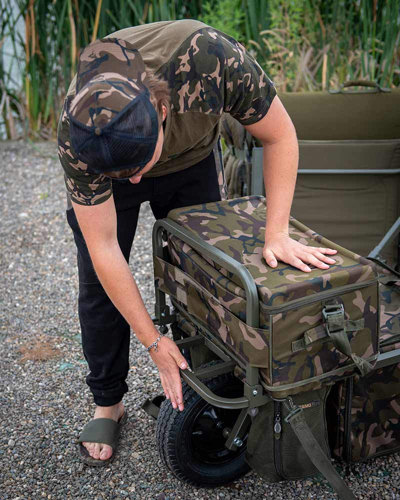 La carriola include una borsa rimovibile Under Barrow Bag con motivo Fox Camo, che offre una comoda conservazione per gli strumenti necessari. Due tasche laterali a rete si trovano accanto alla ruota, ideali per una bottiglia d'acqua da 5 litri o per riporre esche e pastura. La borsa e le tasche si chiudono con cerniera, garantendo un accesso facile e veloce al contenuto, anche quando la carriola è piena.