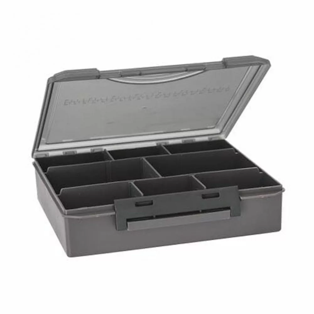 Una scatola di 23 x 20 x 6 centimetri, progettata per la conservazione ben organizzata dell'attrezzatura, la cui suddivisione interna può essere adattata a piacere. Per riporre accessori più piccoli, ami, clip e girelle, sono disponibili 4 scatole da 10 x 6.5 x 2.5 centimetri, che hanno rispettivamente tre, quattro, sei o otto scomparti. Sia le scatole più grandi che quelle più piccole sono dotate di una chiusura resistente, con la quale possono essere chiuse perfettamente. Il materiale è robusto e sul coperchio trasparente è stata aggiunta una pratica scala di misurazione. Un'ottima scelta per ogni pescatore che ama conservare la propria attrezzatura in modo ordinato e trasparente.
