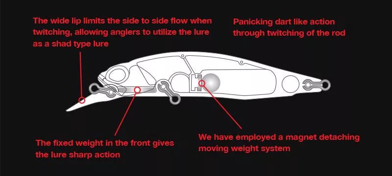 Inoltre, l'esca può essere utilizzata anche come esca tipo shad, con un movimento a dardi "panicato" che può essere ottenuto con un leggero scuotimento della canna. Ciò consente ai pescatori di ottenere abboccate dai bass anche dalla distanza più breve. Questa esca è la scelta perfetta per il recupero lineare e dritto, e anche per la pesca di tipo 'spot-light', aiutando la pesca con il suo movimento a dardi "panicato".