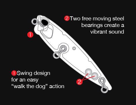 Il design della sua parte anteriore facilita il movimento 'walk the dog', mentre i pesi a movimento libero posizionati nella parte posteriore emettono un suono potente. Testa la sua eccellente capacità di lancio e il suo movimento preciso sul campo, e scopri che il Pencil 65 è davvero un'esca piccola ma potente!