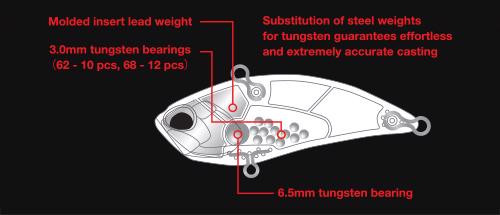 Le sfere d'acciaio fisse (6,5 mm x 1) e le sfere a sonaglio in movimento libero (3,0 mm x 12) sono state sostituite con sfere di tungsteno della stessa dimensione. Inoltre, è stato aggiunto un peso fisso sagomato alla testa dell'esca, aumentando il peso totale di 5 g rispetto al modello normale.
