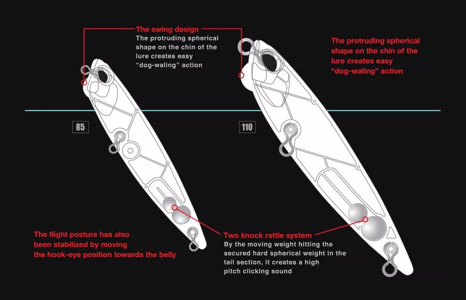 È stato migliorato con un movimento „dog-walking” più stretto, adatto non solo per esplorare grandi aree, ma anche efficace in acque sotto pressione. Ereditando il movimento laterale del modello da 110, il Pencil 85 aiuta la cattura di successo con un'azione più decisa.