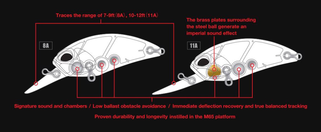 Le prestazioni dell'M65 non si esauriscono con il suo movimento. Ha una camera sonora molto sofisticata. Mentre altre esche crank utilizzano perle o sfere per generare suono, l'M65 11A utilizza un sistema di deflettori sonori. I deflettori metallici perforati sono posizionati verticalmente in una camera dove una sfera entra in contatto con ogni deflettore, creando un suono unico che si propaga più e più volte. Questa doppia tonalità è unica e non si trova altrove.