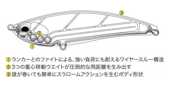 Esca ben gestibile, progettata per la pesca costiera. Il suo corpo alto e piatto, con l'acqua che scorre dalla testa alla schiena, imita il movimento di pesci deboli in acque poco profonde, attirando la spigola.