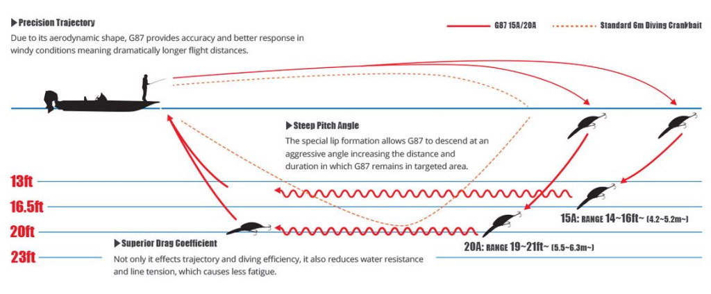 "Durante il progetto durato due anni, i nostri risultati di R&S hanno stabilito un nuovo punto di riferimento nel campo dei crankbait da immersione profonda. Mentre la maggior parte dei pescatori è soddisfatta se il proprio crankbait profondo raggiunge i 130 piedi (circa 40 metri) e sono impressionati se supera i 150 piedi (circa 46 metri), il G87 20A supera stabilmente i 200 piedi (60 metri) con un filo da 12 libbre. Rispetto ai migliori crankbait profondi attualmente utilizzati dai pescatori professionisti, può ottenere un vantaggio fino a 80 piedi (circa 24 metri). Sebbene l'esca sia stata progettata per una profondità di 20 piedi, grazie agli sforzi del signor Adachi può raggiungere una profondità di ben 27 piedi (8 metri) con un solo lancio e recupero" – afferma Swendseid.