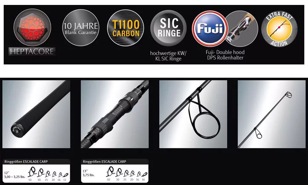 Il cuore della canna Escalade Carp è il rivoluzionario Sic Heptacore Blank, che offre incredibile sensibilità e robusta forza. Grazie a questo, puoi sentire ogni vibrazione, mentre la canna rimane stabile anche sotto il massimo carico. La potenza di lancio di 3,00lbs garantisce una trasmissione di potenza impressionante, permettendoti di lanciare la tua esca con precisione e a lunga distanza, anche con il vento. Questa canna non eccelle solo nella potenza di lancio, ma offre anche un controllo eccezionale durante il combattimento, permettendoti di affrontare con sicurezza le carpe più grandi.