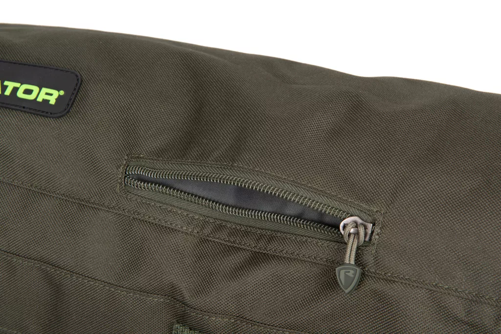 La Predator Quiver può ospitare fino a tre canne montate, offrendo una soluzione perfetta per i pescatori che utilizzano più canne. Durante la progettazione della borsa, è stata prestata particolare attenzione anche alla conservazione degli accessori: sono disponibili tasche laterali separate per il misuratore di pesce o il materassino per carpe, il guadino Fox Rage Predator, e i supporti per canne. Per un maggiore comfort, queste tasche sono state progettate in modo da poter contenere facilmente anche i supporti per canne dotati di segnalatori di abboccata.