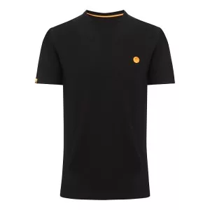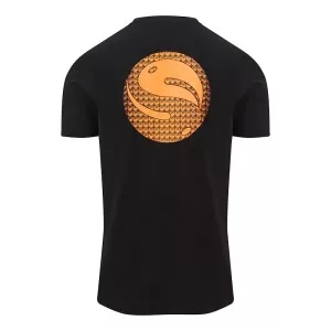 T-shirt leggera a maniche corte, di colore nero, con un piccolo logo Guru ricamato arancione sul davanti e un grande logo Guru sul retro.