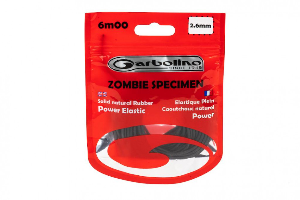 Il Garbolino ZOMBIE è stato sviluppato specificamente per la pesca con la roubasienne a grandi pesci, unendo una forza straordinaria a un'elevata resistenza all'abrasione e una superficie liscia come la seta. L'elastico, adatto a combattere pesci di dimensioni capitali, è disponibile in confezioni da 6 metri e con diametri che vanno da 2,6 mm a 4,8 mm.