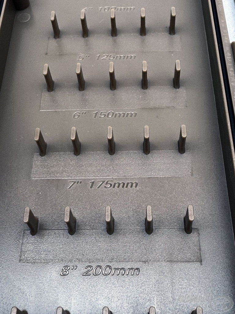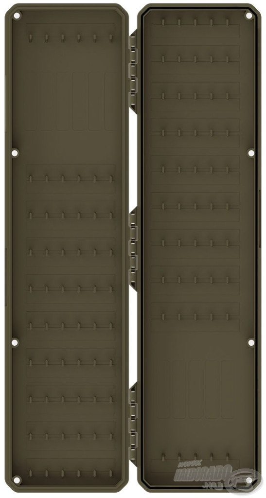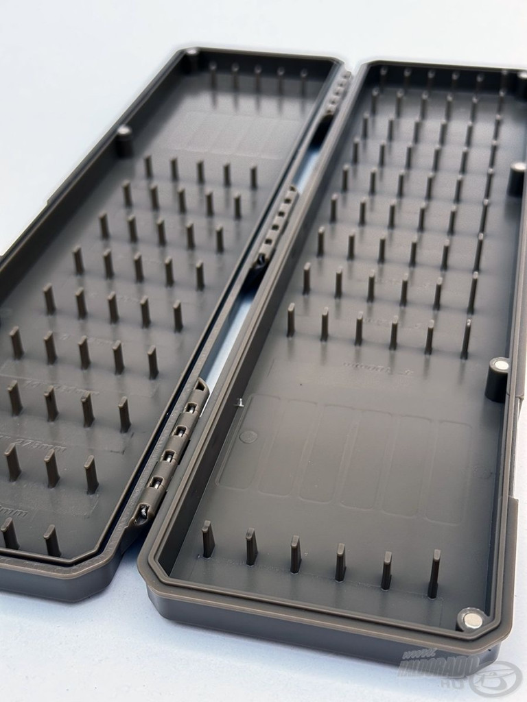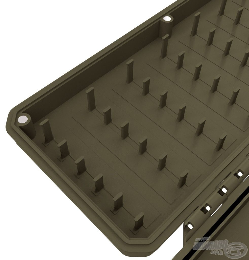 La disposizione interna del porta terminali consente di fissare terminali di diverse lunghezze, e il posizionamento preciso è facilitato da perni di fissaggio e marcature di dimensioni. Il coperchio si chiude con otto potenti magneti, proteggendo così gli ami in modo impermeabile dalla ruggine e dallo sporco.