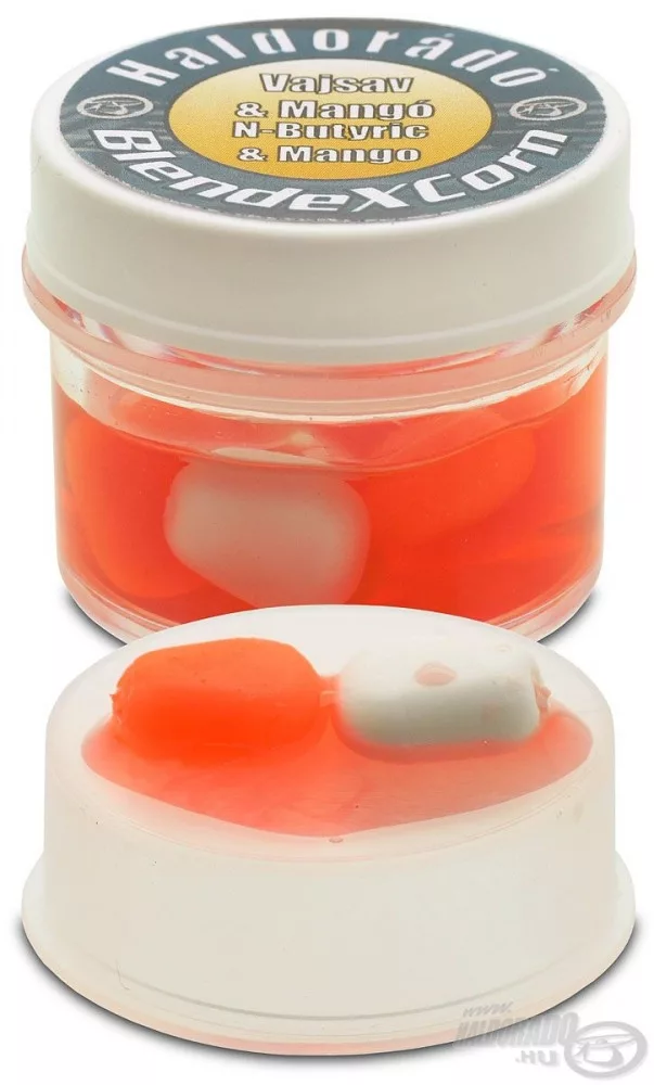 Il Haldorádó BlendeXCorn Acido Butirrico & Mango ha un aroma estremamente intenso e pungente grazie all'acido butirrico, che il mango ammorbidisce leggermente, creando insieme una combinazione aromatica speciale. I chicchi di mais sono arancioni e bianchi. È particolarmente consigliato per la pesca in acque calde, sia per carpe che per amur. I pesci gatto in genere non amano il mais di gomma, quindi può essere usato con sicurezza anche nelle acque infestate da essi, ma durante i test è sembrato che evitassero completamente questa esca BlendeXCorn, mentre i pesci di valore (carpe, amur, carassi) potevano essere selezionati facilmente! Ricordatelo nei mesi estivi!