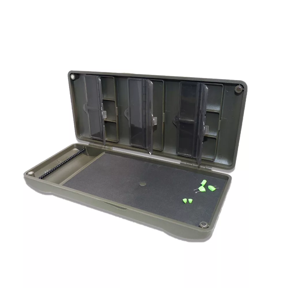 Un lato della scatola contiene 12 scomparti chiudibili, dove puoi facilmente riporre i piccoli accessori più importanti, come stopper per boilies, perline, girelle, tubi termorestringenti e altri accessori per rig. In questo modo, tutto rimane in un unico posto, facilmente accessibile e organizzato, facilitando i preparativi per la pesca. L'altro lato può contenere fino a 20 finali, con una lunghezza massima di 20 cm, così puoi preparare i tuoi terminali rapidamente ed efficacemente in qualsiasi situazione.