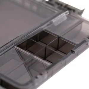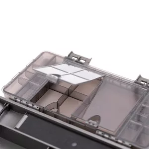 Su un lato troverai non meno di 21 scomparti più piccoli con coperchio, dove puoi ordinare i tuoi piccoli accessori. Sull'altro lato ci sono due scomparti più grandi separati da una parete fissa. Questi sono perfetti per gli attrezzi da montaggio, per la conservazione di bobine di finali per ami. Qui troverai anche il porta-finali rimovibile, dove puoi tendere i tuoi finali già legati con piccole spine (circa 8 possono essere inseriti). Sotto questo, puoi anche riporre alcuni oggetti più piatti.