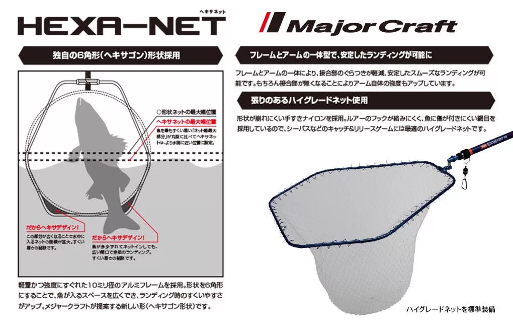 Una versione compatta della testa di guadino Major Craft HexaNet. Grazie all'applicazione della rete rivestita in gomma, il corpo del pesce viene graffiato a malapena, anche se il pesce è vivace. L'ampia forma esagonale crea una cornice durante la salpata. Consigliata per la pesca leggera in acqua salata, come ad esempio per il black snapper e le rocce dure.
