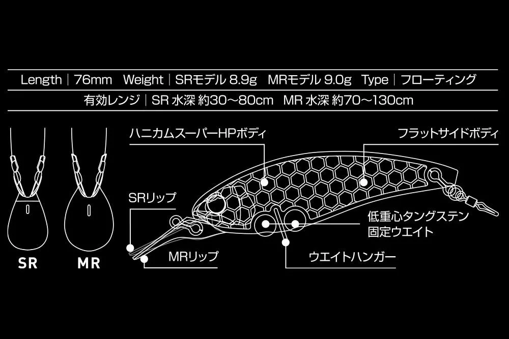 La dimensione del corpo di 76 mm si adatta perfettamente ai pesci foraggio più piccoli che migrano all'inizio della stagione, ma è universalmente utilizzabile tutto l'anno. Le sue dimensioni consentono all'ayu [la specie di pesce target] di attaccare con coraggio e senza sospetti. Il suo design robusto fornisce un peso adeguato, rendendolo utilizzabile sia con attrezzatura da spinning (a bobina fissa) che da baitcasting (a mulinello rotante). La sua posizione di volo stabile e il baricentro fisso consentono lanci estremamente lunghi quando necessario.