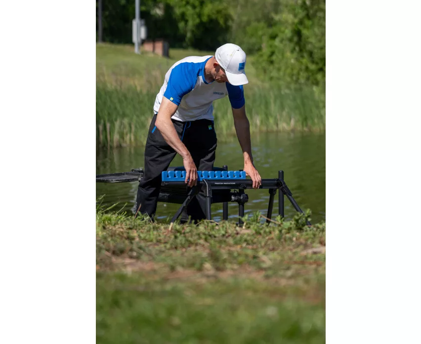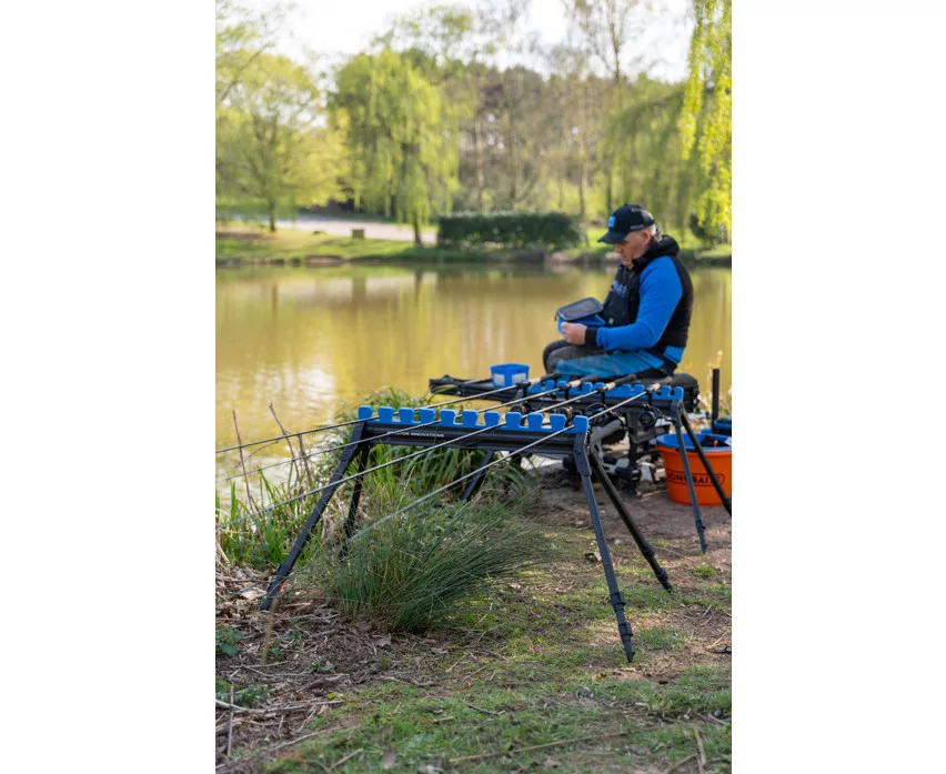 Il supporto è realizzato con materiali robusti ma leggeri, che proteggono a lungo i top set conservati al suo interno da danni e agenti esterni. Grazie al suo design piatto, si posiziona stabilmente sul terreno, mentre le quattro gambe telescopiche estensibili garantiscono la stabilità del supporto anche su terreni vari. L'inserto in schiuma scorrevole offre una protezione extra alle canne, impedendo loro di muoversi e urtarsi durante il trasporto.