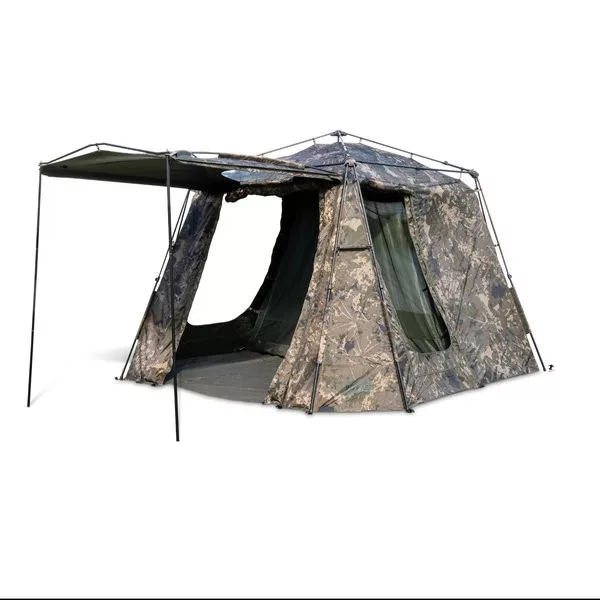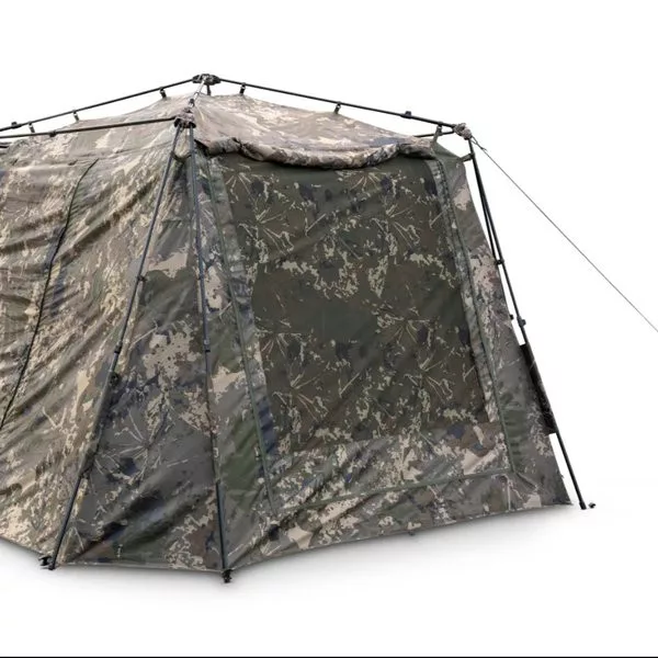 versione Camo Pro aggiornata del Blockhouse, ora con veranda ampliata e modulabile, combinata con la già collaudata capsula interna in rete Nash e un robusto telo di fondo completamente sigillabile. La struttura a doppio montante angolare è anch'essa estremamente robusta e resiste ai forti venti, mentre i pannelli laterali possono essere chiusi o coperti individualmente secondo necessità. Il pannello del tetto in PVC migliora l'illuminazione naturale interna.