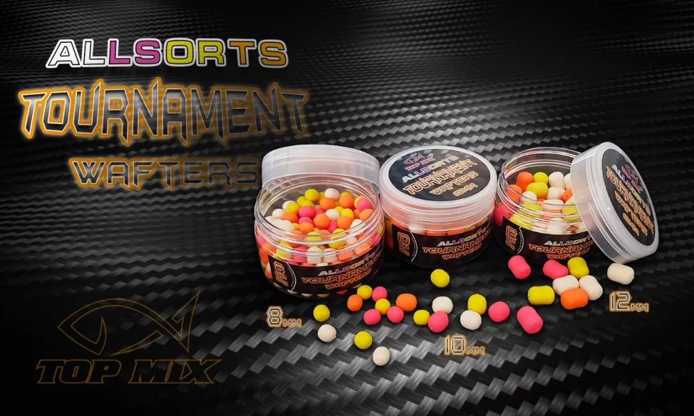 Le esche TOP MIX Allsorts Tournament Wafters sono pellet solubili realizzati in base a molti anni di esperienza nelle competizioni, che contengono in un unico barattolo i colori più utilizzati durante le sessioni di pesca.